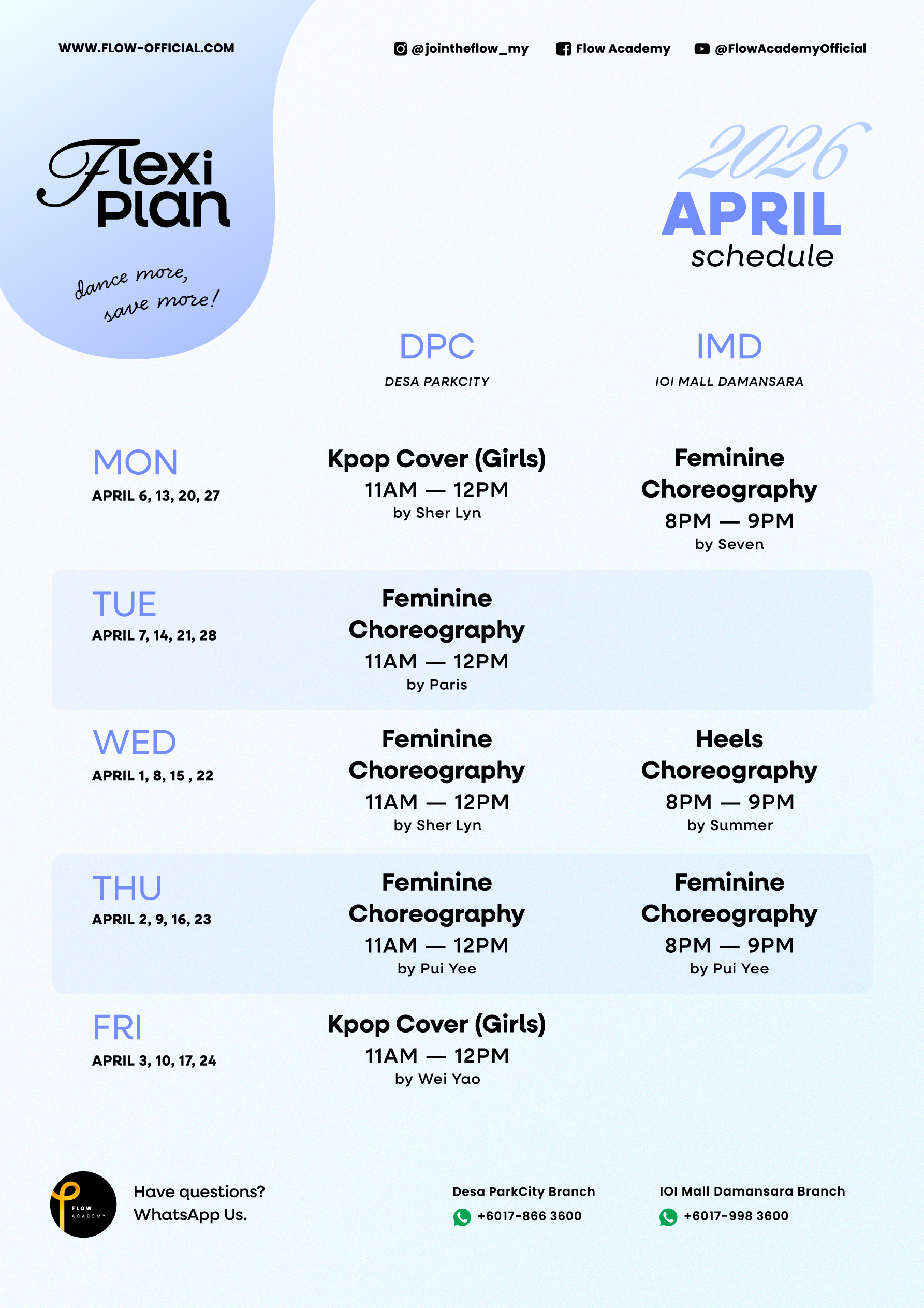 Our Flexi-Plan offers monthly updates and provides you with greater flexibility in choosing your class times.